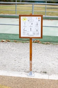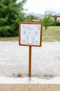 Il progetto prevede anche per questo parco la creazione di una cartellonistica specifica per ogni struttura con le indicazioni delle regole e delle modalità possibili di gioco.
